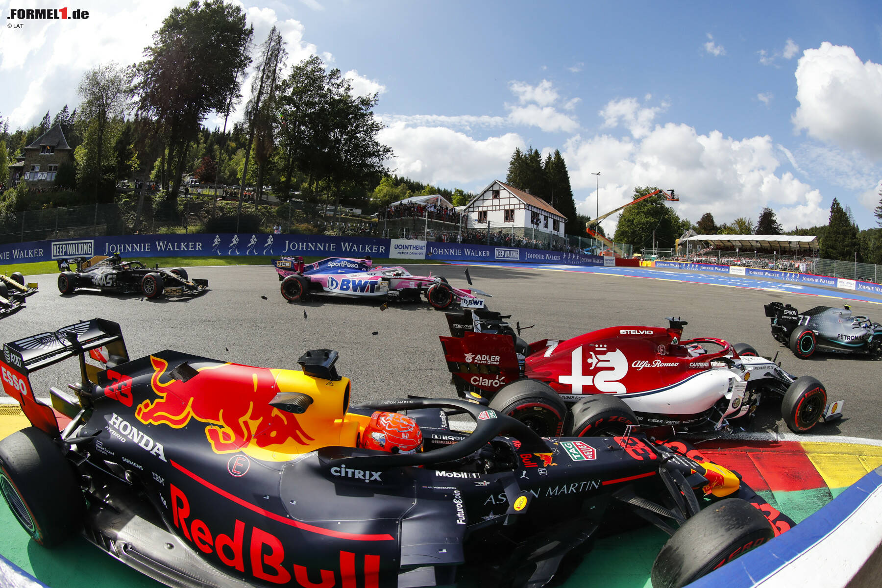 Der Red Bull des Niederländers erlitt durch den Zwischenfall links vorne eine Beschädigung an der Radaufhängung. Zwar fuhr Verstappen noch weiter, nach Eau Rouge bergauf konnte er aber nicht mehr einlenken. Die Radaufhängung brach und er krachte geradeaus in die Reifenstapel. Das Rennen war für den Publikumsliebling bereits vorbei. Das Safey Car kam auf die Strecke.