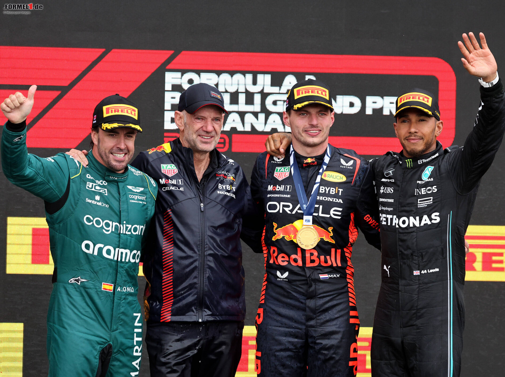Denn neben Max Verstappen, Fernando Alonso und Lewis Hamilton durfte auch Designer Adrian Newey anlässlich des 100. Sieges von Red Bull mit auf das Treppen. Newey, dessen Autos elf Konstrukteurstitel holten, feierte nämlich sein persönliches Jubiläum: Für ihn war Kanada der 200. Formel-1-Sieg seiner Karriere - die Hälfte davon holte er mit Red Bull.