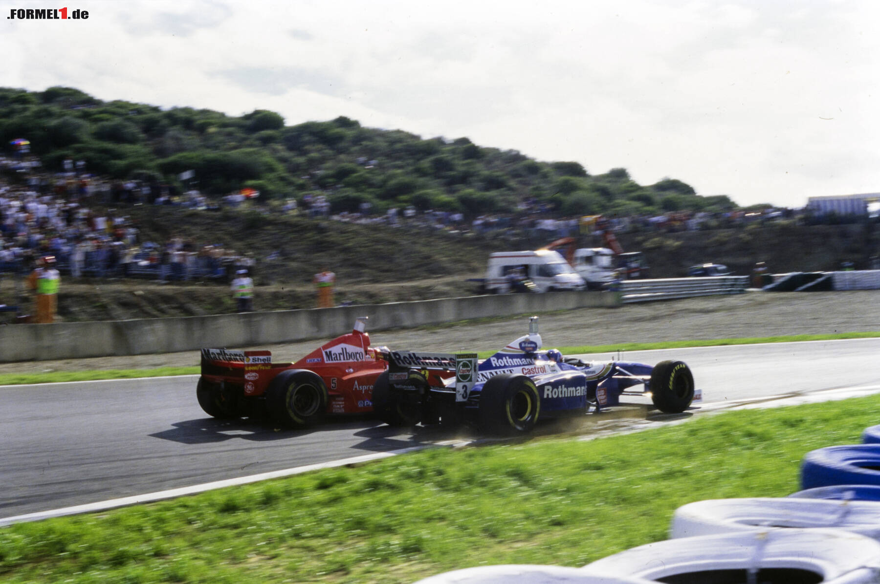 Heute vor 22 Jahren kam es beim Europa-Grand-Prix in Jerez zu einem entscheidenden Duell um den WM-Triumph: Auf der Strecke holte Jacques Villeneuve auf Michael Schumacher auf, dann folgte die Szene, die hier im Bild festgehalten ist - der "Rammstoß" von Schumacher gegen Villeneuve.
