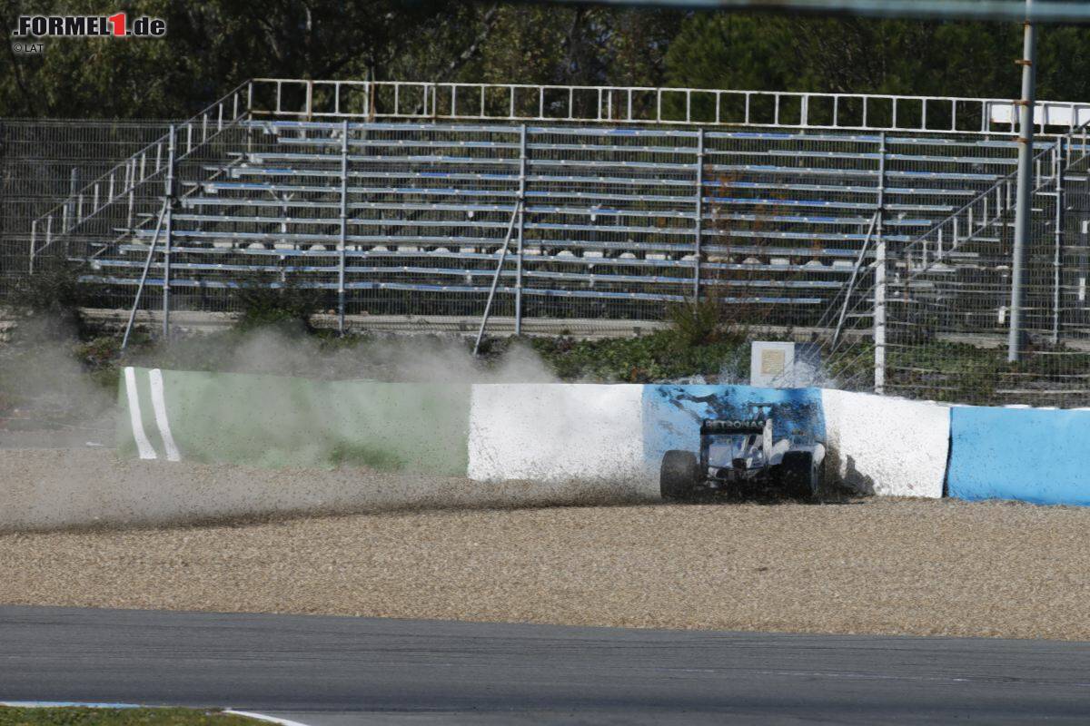 Mercedes hat bestätigt, dass Lewis Hamilton wegen eines defekten Frontflügels beim Test in Jerez mit dem neuen F1 W05 abgeflogen ist - Der Brite ist unverletzt