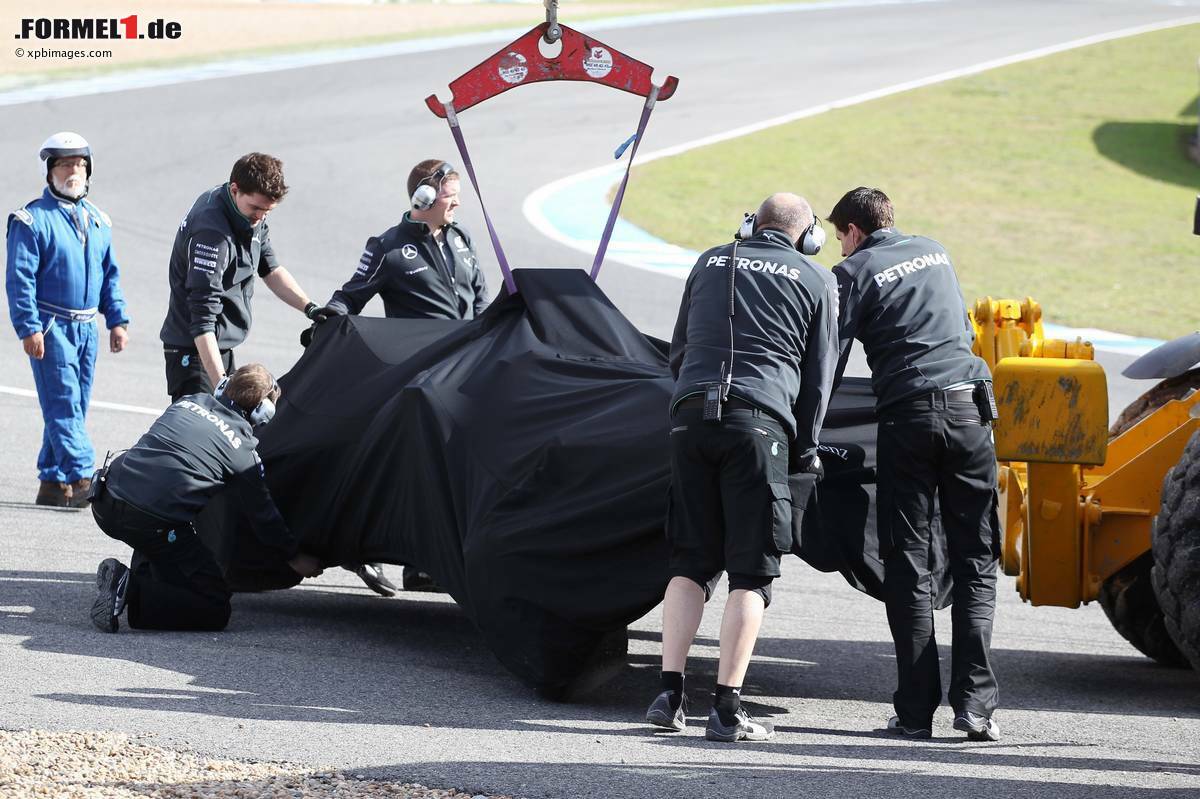 Mercedes hat bestätigt, dass Lewis Hamilton wegen eines defekten Frontflügels beim Test in Jerez mit dem neuen F1 W05 abgeflogen ist - Der Brite ist unverletzt