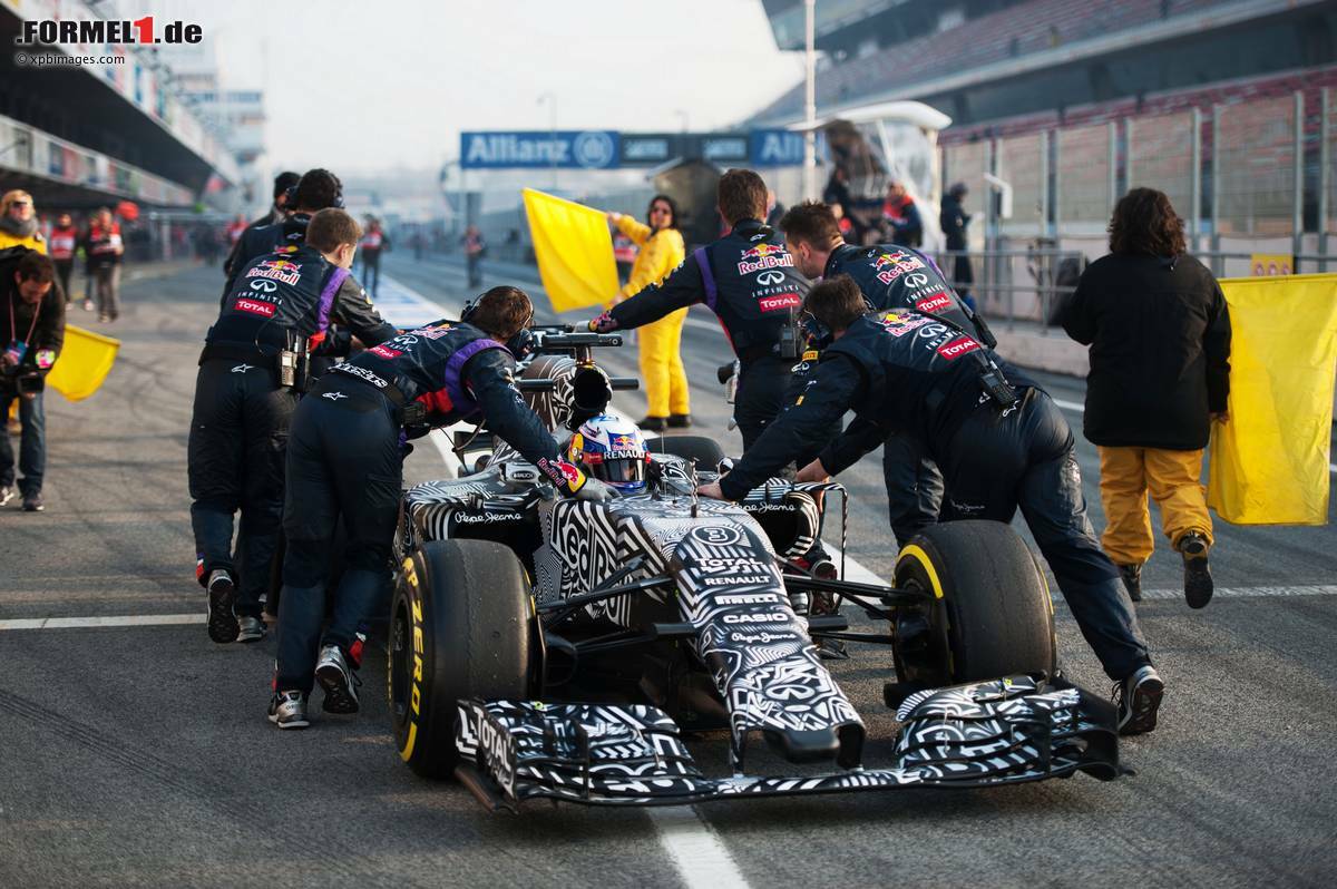 (Motorsport-Total.com) - Red Bull hat seine Ankündigung, beim zweiten von drei Formel-1-Wintertests in Barcelona "die Hosen runterzulassen", wahr gemacht. Am Freitag sorgte Daniel Ricciardo im RB11 in 1:24.574 Minuten für die beste Rundenzeit des Tages (die detaillierten Ergebnisse!). Alle Probleme scheinen aber längst nicht ausgeräumt: Nachdem der Tarnkappenbomber aus Milton Keynes zum Testbeginn am frühen Morgen an der Boxenausfahrt stehengeblieben war, erlebte das Programm eine weitere ungeklärte Unterbrechung.