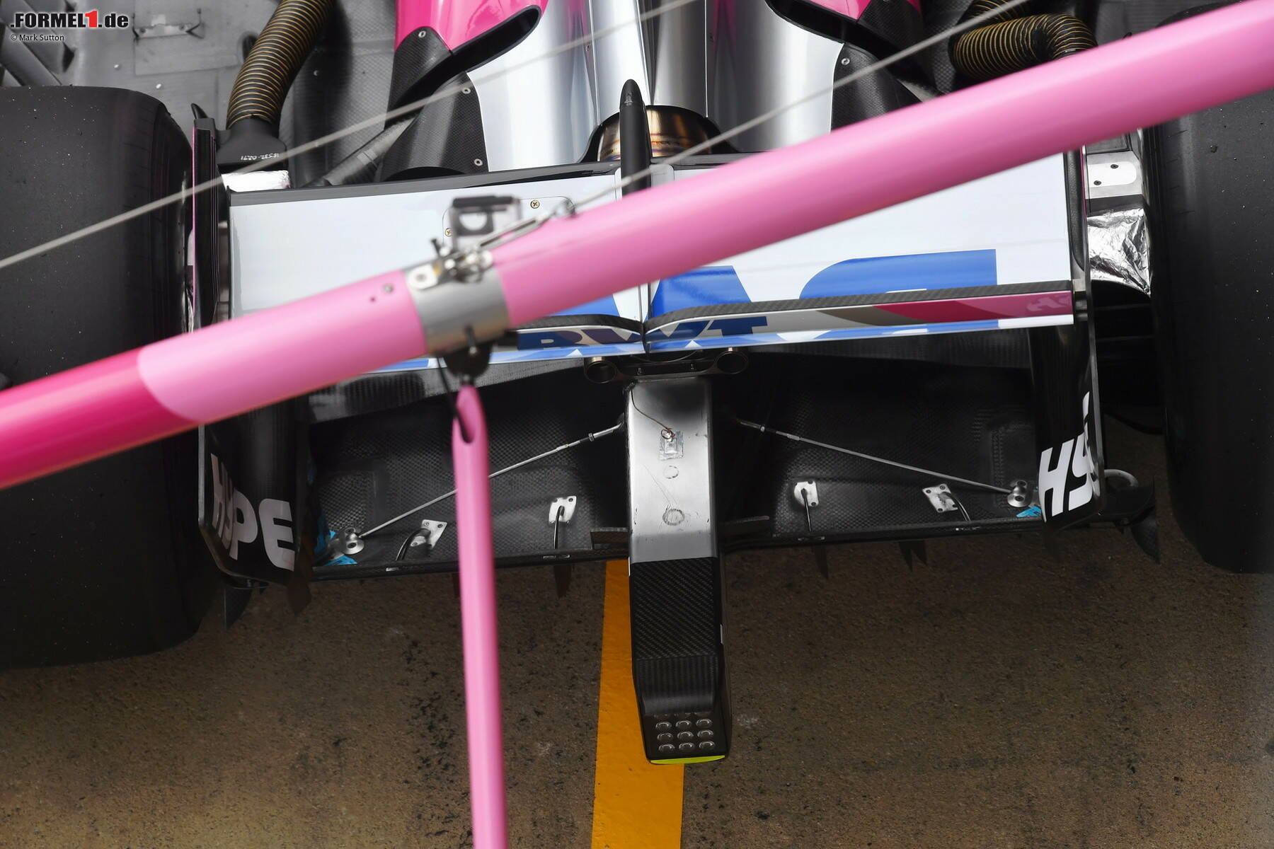 Diese Aufnahme zeigt sehr schön, wie Force India beim VJM11 am Diffusor auf kleine Haltestreben setzt, um die Gurney-Flaps an der oberen Abschlusskante an Ort und Stelle zu halten. Ebenfalls gut zu erkennen sind der Heckflügel, das zentral liegende Auspuffrohr sowie die hintere Crash-Struktur.