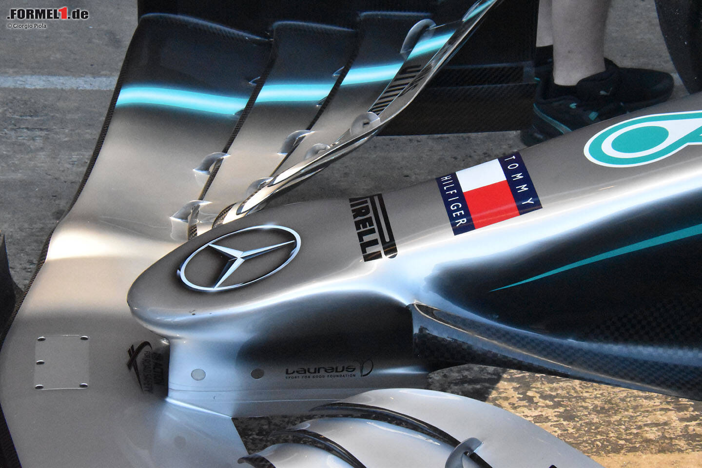 Rein aerodynamisch hat sich aber noch mehr getan am Silberpfeil: Seitlich der S-Schacht-Öffnung auf der Fahrzeugnase sind jetzt kleine Luftleitbleche installiert worden, die den Luftstrom an dieser Stelle glätten und gezielter nach hinten ableiten sollen.