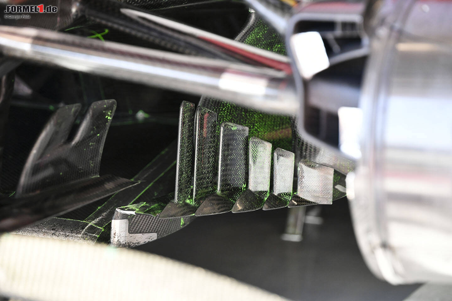Detailaufnahme der seitlichen Windabweiser am C39-Ferrari. Hier ist gut zu erkennen, wie kleinteilig und zerklüftet die Aerodynamik in diesem Bereich des Fahrzeugs ausfällt.