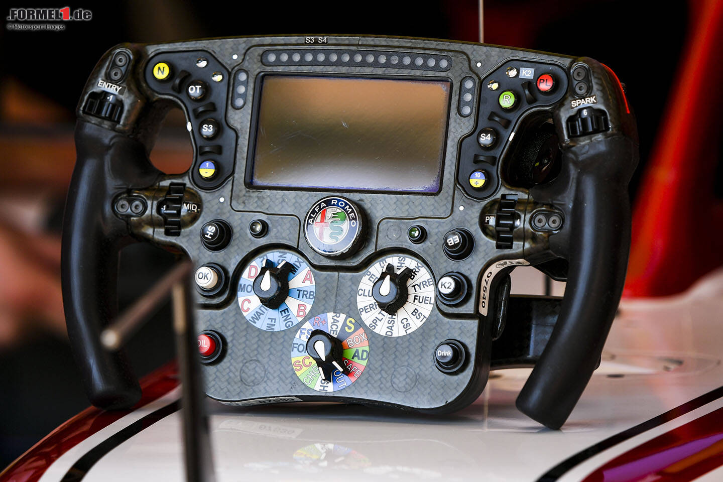 Das Alfa-Romeo-Lenkrad für die Saison 2020 mit drei großen Wählscheiben, diversen Knöpfen und Rastern zum Verändern der Einstellungen während der Fahrt. Jeder Fahrer hat ein individuell gestaltetes Lenkrad, erstellt nach seiner persönlichen Ergonomie und den jeweiligen Wünschen.